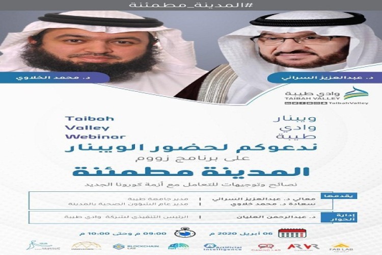 تنظم شركة وادي طيبة بـجامعة طيبة وبالتعاون مع الشؤون الصحية بمنطقة المدينة المنورة مبادرة مجتمعية وتقيم لقاءً عن بعد بعنوان “المدينة مطمئنة” الذي سيطرح نصائح وتوجيهات للتعامل مع أزمة كورونا الجديدة.