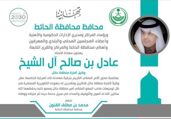 سعادة الأستاذ/ عادل بن صالح آل الشيخ وكيل امارة منطقة حائل ، بمناسبة صدور أمر ملكي يقتضي بترقيته إلى المرتبة الخامسة عشر ،