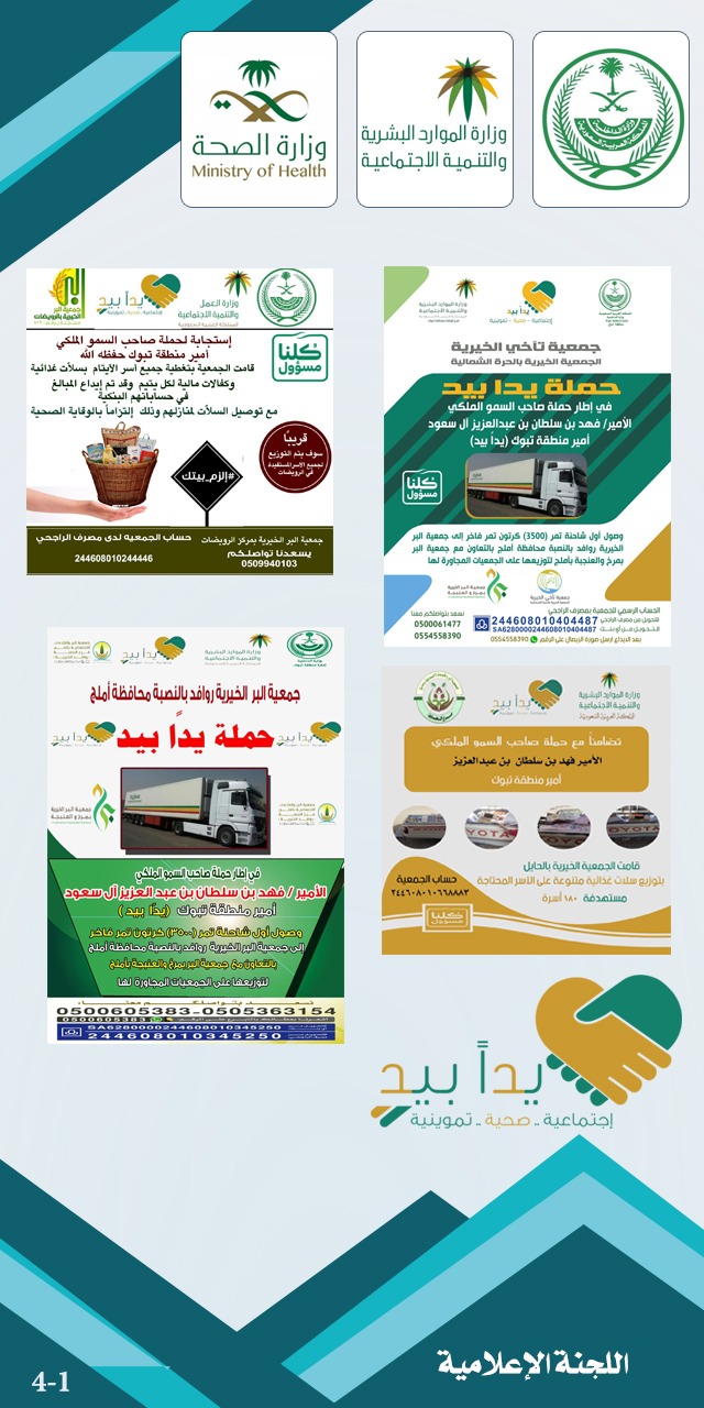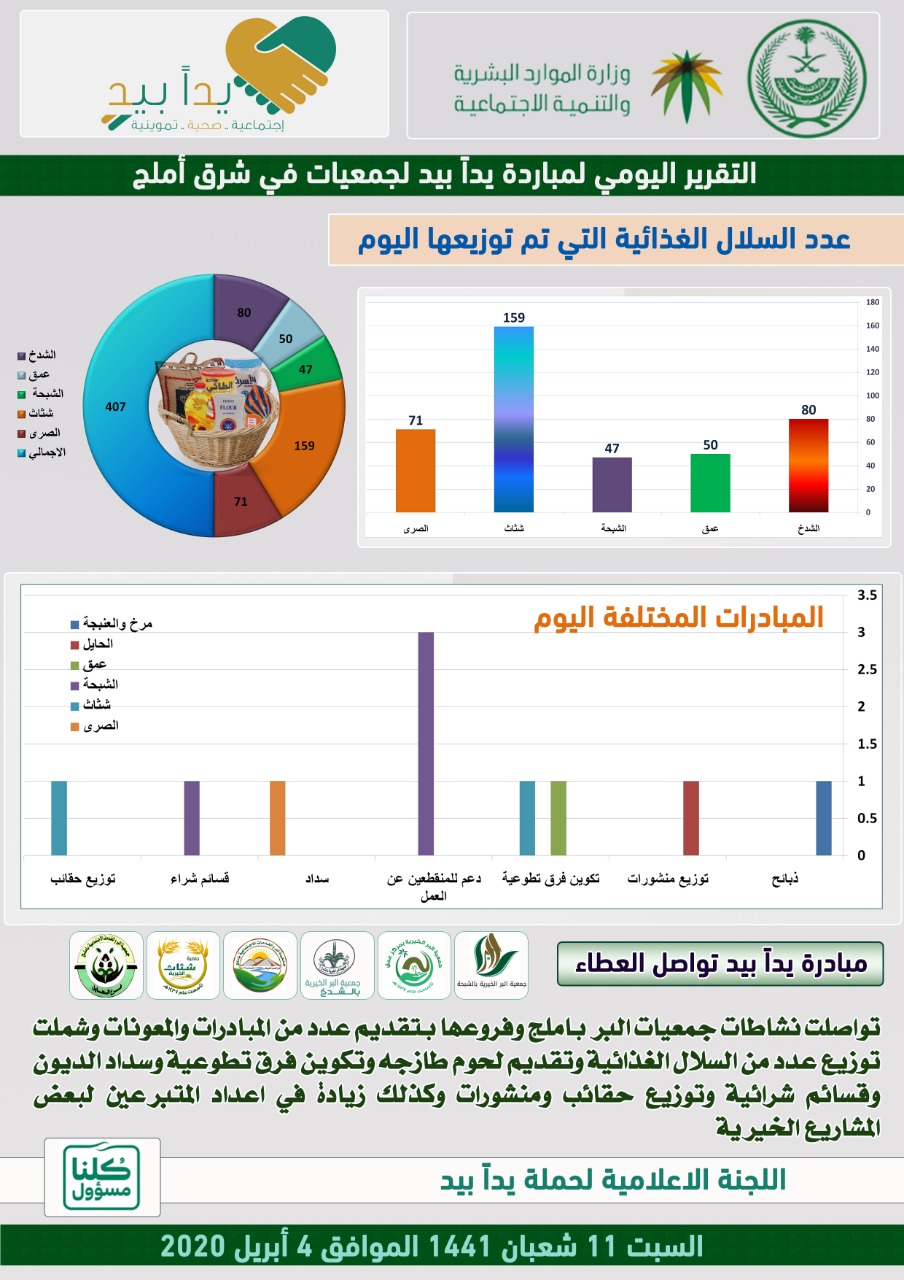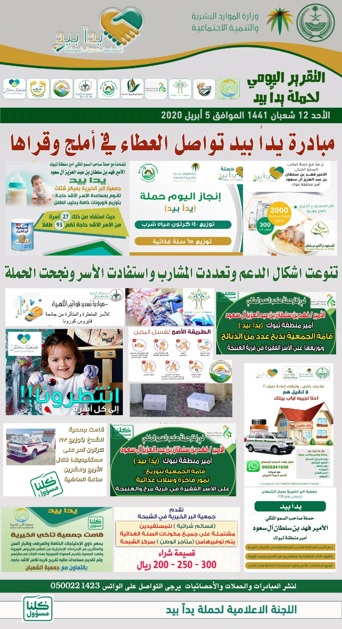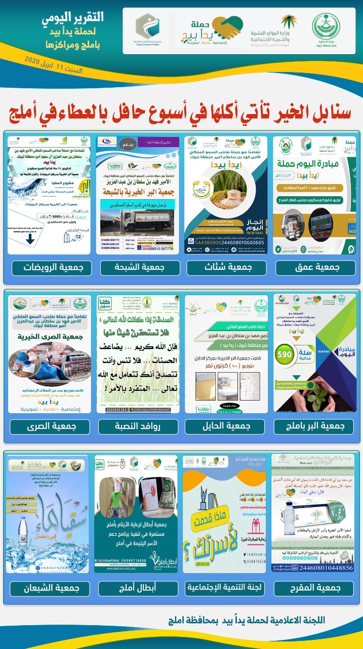 تواصل جمعيات املج الخيرية مبادراتها التي وصل قيمتها بحوالي 5مليون ريال ،ضمن حملة ” يدا بيد ” التي اطلقها صاحب السمو الملكي الأمير فهد بن سلطان أمير منطقة تبوك حيث وجه سموه برصد الأسر المحتاجة وأصحاب الأعمال الميدانية الصغيرة المتأثرة خلال فترة منع التجوّل، والأشخاص المتأثرين سواء صحية او اجتماعية وغيرها ، وتقديم الدعم لهم لمواجهة الآثار الناجمة عن انتشار فيروس كورونا، من جهته وجه محافظ أملج زياد البازعي بتشكيل لجنةٍ لرصد الحالات التي تستحق المساعدة في المحافظة .