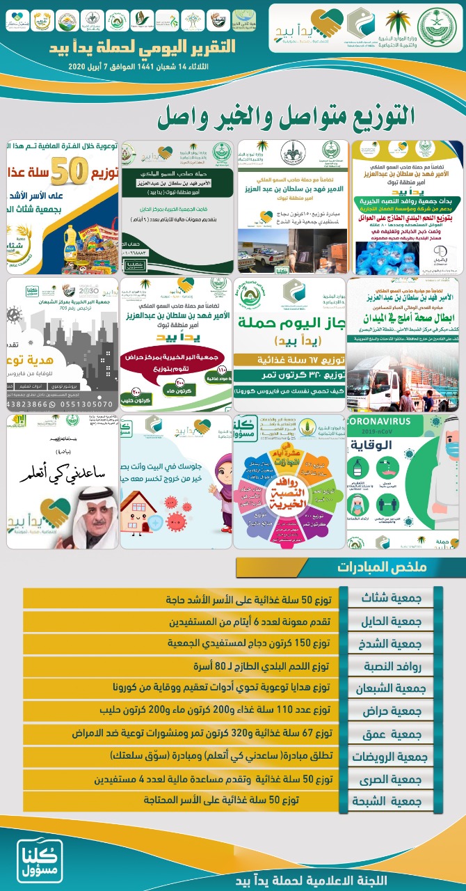 من جانبه اوضح مدير العلاقات العامة بجمعية البر والخدمات الاجتماعية بأملج محمود ناهض الزراع انه منذ اطلاق مبادرة “يداً بيد” ، استجابت الجمعيات الخيرية في املج ومراكزها واللجان الاجتماعية والصحية لمبادرة امير المنطقة في حصر المتضررين من الاجراءات الاحترازية التي طبقت لتفادي انشار العدوى بفيروس كورونا (كوفيد19) وبمتابعة من محافظ املج زياد بن عبدالمحسن البازعي، تم عقدت اللقاءات الافتراضية مع رؤساء الجمعيات للتنسيق فيما بينها وتشكيل اللجان واعداد التقارير اليومية عن سير هذه الحملة التي تنوعت فيها المبادرات المتميزة وشملت المتضررين من الاجراءات المتخذة والمستفيدين في قوائم الجمعيات والاطفال في المنازل والايتام والارامل ، واضاف انه بناء على التقرير الاخير بلغ عدد المبادرات 137 مبادرة بمبلغ اجمالي قدرها 5,386,421 ريال شملت 63760 مستفيد ولا زالت المبادرات مستمره في الايام القادمة لتخفيف الاثار المترتبة على الأسر والافراد ممن توقفت اعمالهم وقل دخلهم بدعم اهل الخير في هذا الوطن المعطاء وبجهود المتطوعين في المحافظة.