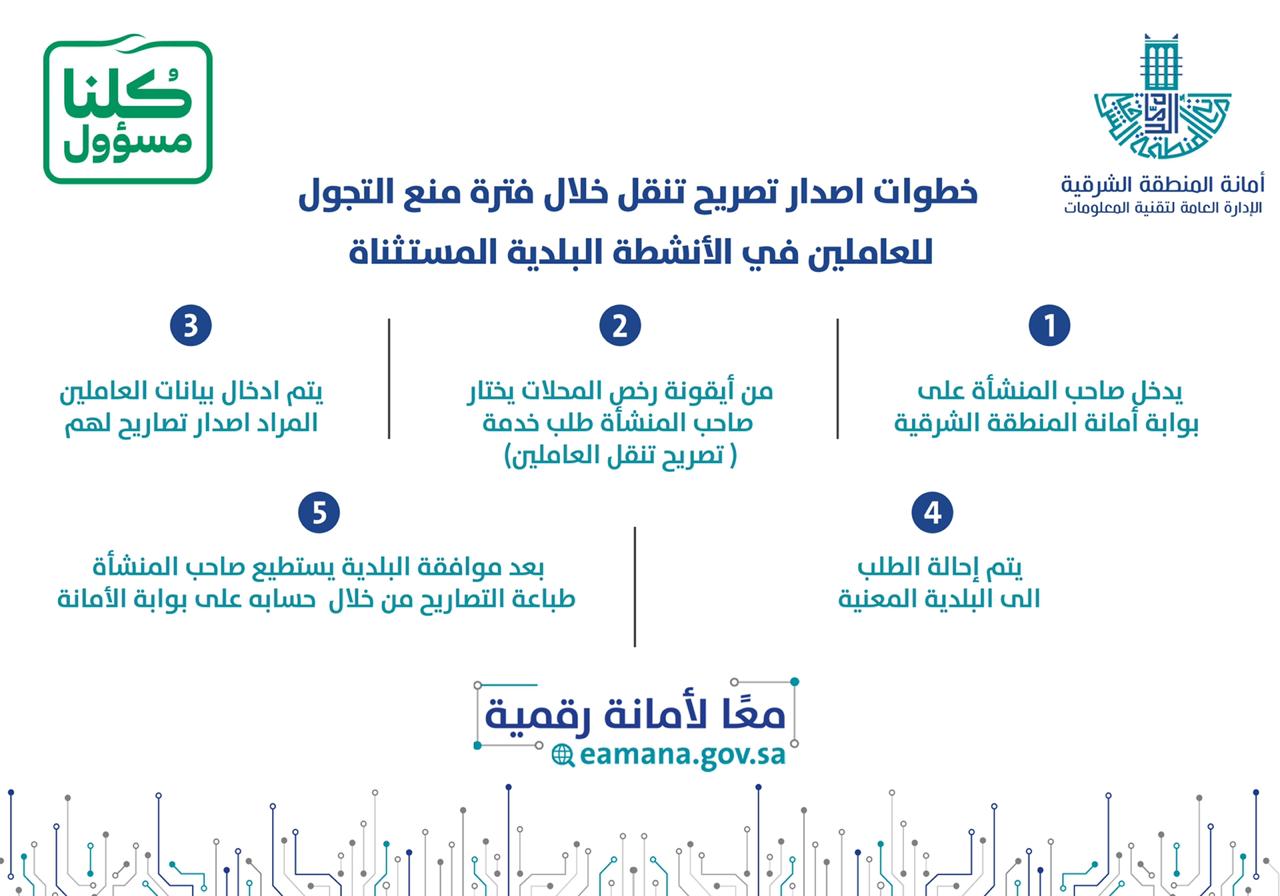 وذكر المتحدث الرسمي بأمانة المنطقة الشرقية محمد بن عبد العزيز الصفيان في بيان صحافي: أن الإدارة العامة لتقنية المعلومات بالأمانة أطلقت خدمة إصدار تصاريح التنقل خلال فترة منع التجول للعاملين في الأنشطة البلدية “، المُستثناة ضمن نطاق التراخيص الصادرة من نظام الأمانة، وذلك تحت شعار ” معاً لأمانة رقمية “.