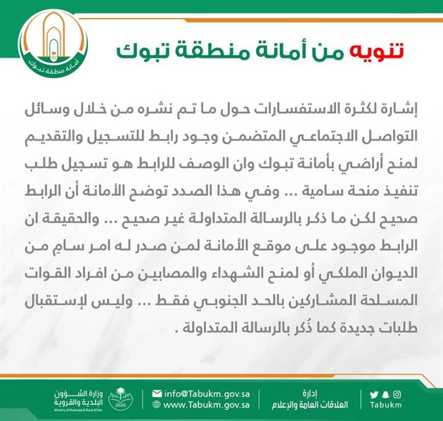 كشفت أمانة منطقة تبوك، عن حقيقة رسالة متداولة تتضمن رابطاً للتسجيل للحصول على منح أراض جديدة بالمنطقة.