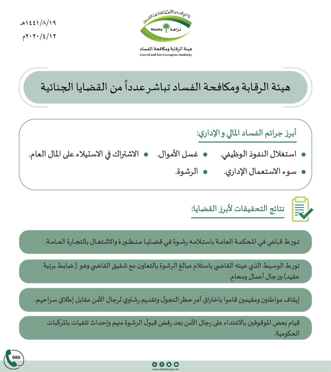 صرح مصدر مسؤول بهيئة الرقابة ومكافحة الفساد “نزاهة” أن الهيئة باشرت قضية فساد مالي وإداري متورط بها اثنان من قيادات الشؤون الصحية بمنطقة الرياض بالاشتراك مع ستة أشخاص أحدهم مالك لأحد الفنادق، وذلك في استغلال إنفاق الدولة السخي لاحتواء الأزمة الحالية المتعلقة بفيروس كورونا المستجد ( كوفيد – 19 ) وتوفير السكن الملائم للمواطنين العائدين من الخارج لقضاء مدة الحجر الصحي، من خلال اشتراط عمولات على الفنادق للحصول على فرصة التعاقد مع وزارة الصحة مما نتج عنه تحميل الدولة نفقات مالية تفوق السعر العادل للخدمة.