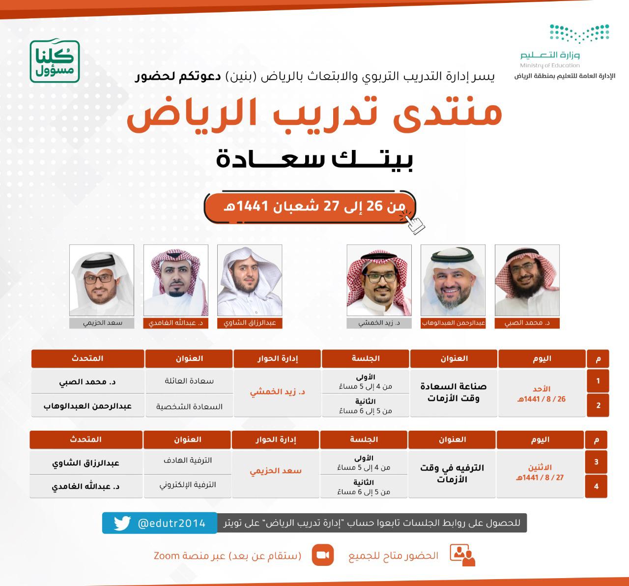 أطلقت الإدارة العام للتعليم بمنطقة الرياض “منتدى تدريب الرياض” الذي سيقام عن بعد عبر منصة برنامج “زوم” والذي يأتي انطلاقا من مسؤوليتها الاجتماعية تجاه الأسرة والمجتمع ويقدمها نخبة من المدربين والمستشارين المعروفين.