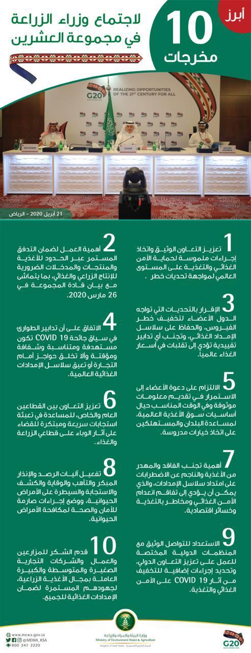عقد وزارة الزراعة في مجموعة العشرين اجتماعاً افتراضياً اليوم، من أجل تعزيز التعاون الوثيق واتخاذ إجراءات ملموسة لحماية الأمن الغذائي والتغذية على المستوى العالمي، ومواجهة التحديات التي تواجه العالم للتخفيف من آثار خطر COVID-19.