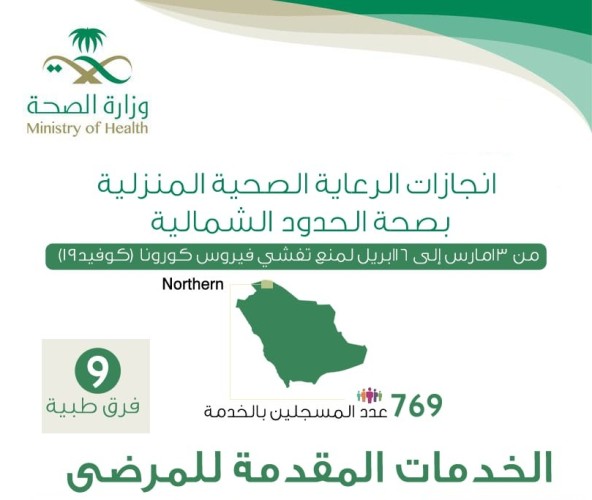 قالت صحة الحدود الشمالية أن إجمالي عدد المستفيدين من خدمات الرعاية الصحية المنزلية بلغ ٧٦٩ مستفيد خلال شهر واحد ومن خلال 9 فرق طبية حيث بلغ عدد من تم تقديم الخدمة لهم عن طريق الاتصال المرئي 528 مستفيد وعدد 407 مستفيد من خدمات الاتصال السمعي وتوصيل الأدوية والمستلزمات الطبية للمسجلين بالخدمة