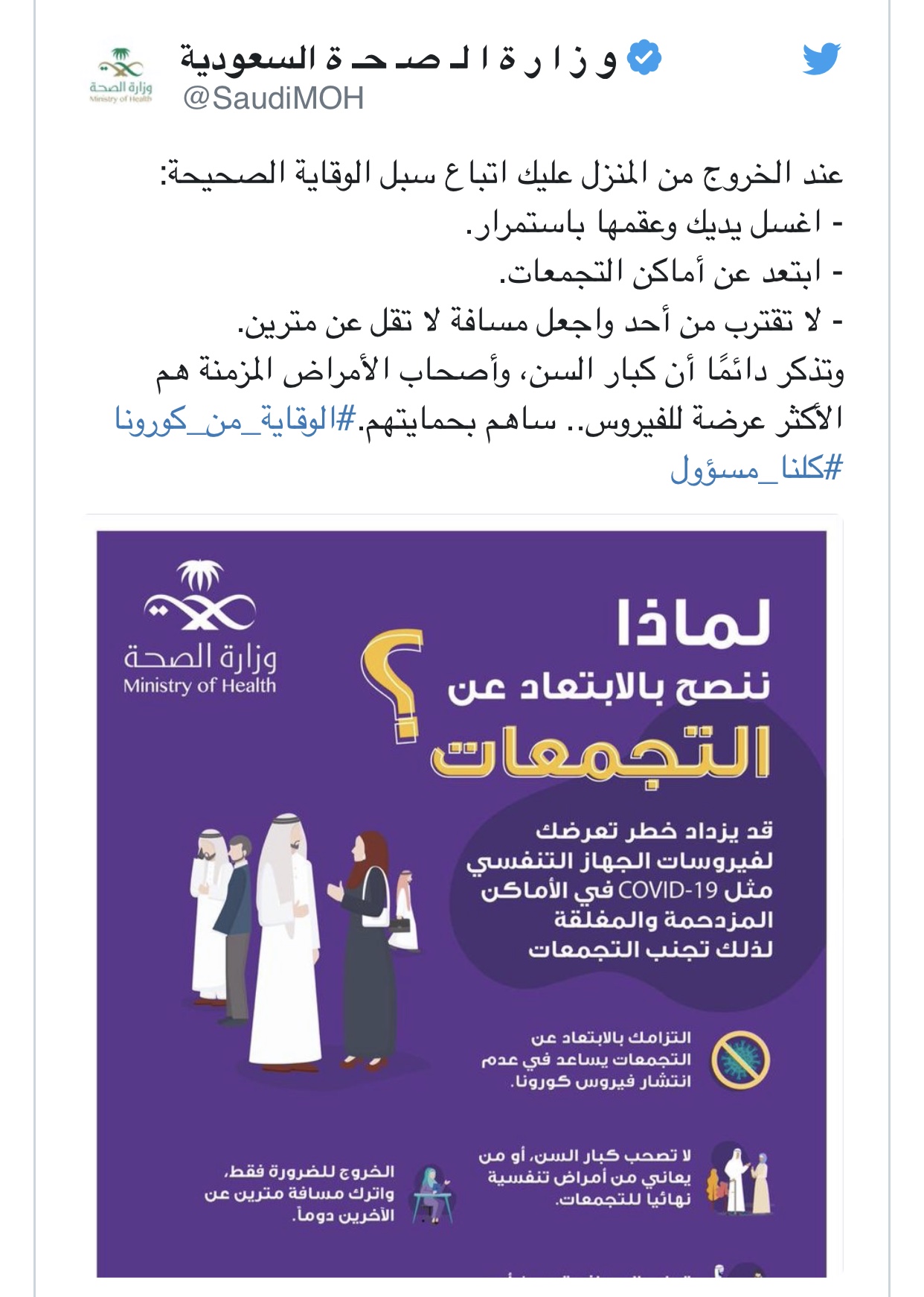 وجهت وزارة الصحة عدة نصائح مهمة للمواطنين والمقيمين عقب صدور أمر خادم الحرمين الشريفين الملك سلمان بن عبدالعزيز برفع منع التجول جزئياً في جميع مناطق المملكة ما عدا مكة ابتداءً من اليوم (الأحد) حتى 20 رمضان المبارك.