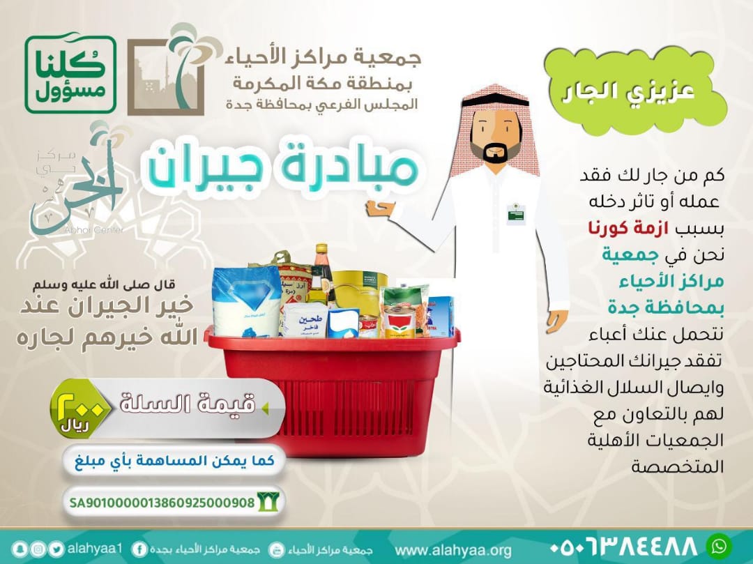 ومن ناحيته أوضح رئيس مكتب حي أبحر الرجالي المهندس ياسر الأنصاري بأن المكتب مستمربتعاونه مع مركز ابحر النسائي في تقديم الخدمات لسكان حي ابحر طيلة شهر رمضان المبارك بمشيئة الله وإيصالها إلى منازل المستفيدين المسجلين بالمركز والمتأثرين من جائحة فايروس كورونا، ومن جانبها قدمت رئيسة المركز النسائي لمركز حي أبحر الأستاذة هناء فلمبان شكرها لادارة جمعية مراكز الأحياء بمحافظة جدة و لفاعلي الخير والجهات الداعمة لمشروع ومبادرة ( جيران ) وذلك لدعم الأسر المتعففة ومن ذوي الحاجة لتساهم في تحقيق حملة(برا بمكه)التي اطلقتها أمارة منطقة مكة المكرمة بشراكه استراتيجيه بين مجلس الجمعيات الاهليه واتحاد جمعيات خيريه في جده حيث تم تشكيل فريق عمل من المتطوعين والمتطوعات لتوزيع السلال الغذائي وتسجيل الكشوفات للمتقدمين من سكان ضاحية أبحر وكافة أحيائها ويشرف على هذا الفريق التطوعي الاستاذة حنان الدوعان