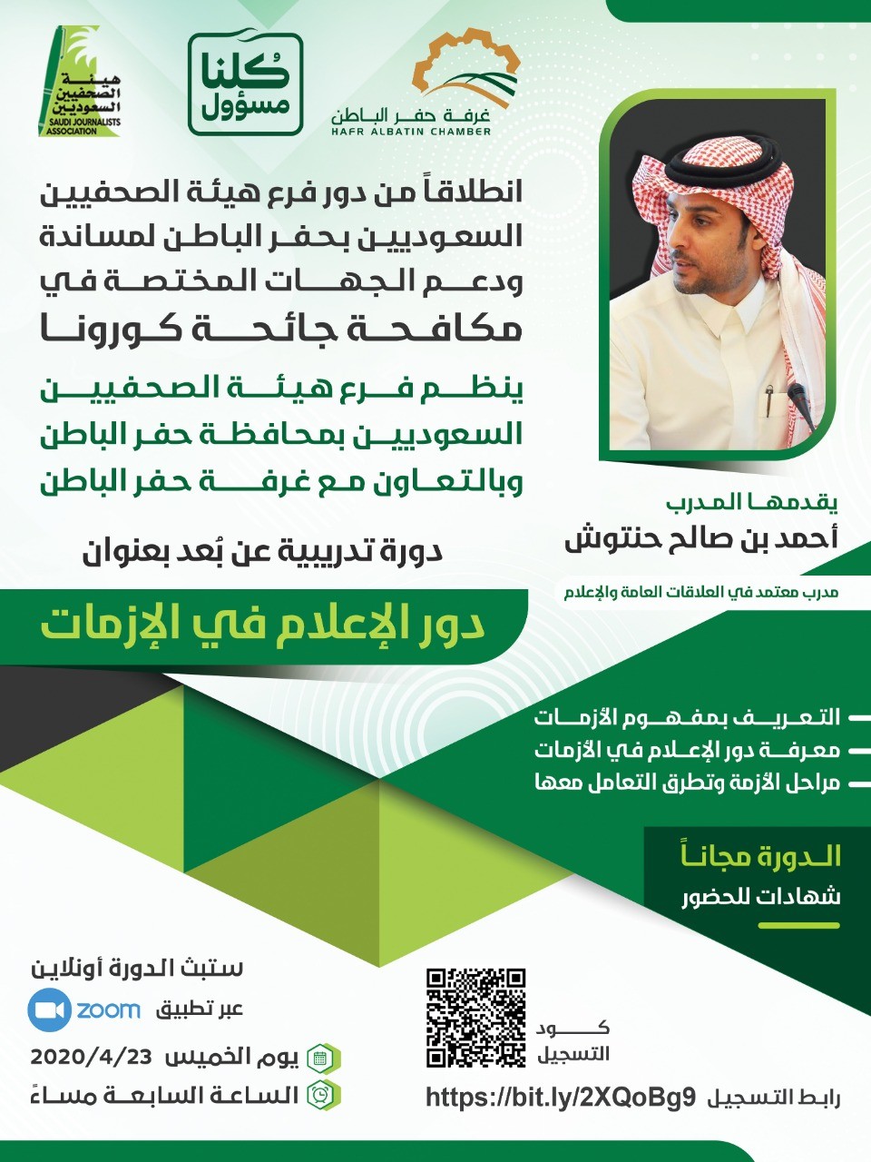 نظمت هيئة الصحفيين السعوديين بحفرالباطن دورة تدريبية عن بُعد بعنوان «دور الإعلام في الأزمات» بمشاركة 300 اعلامي واعلامية، قدمها المدرب أحمد بن صالح حنتوش.