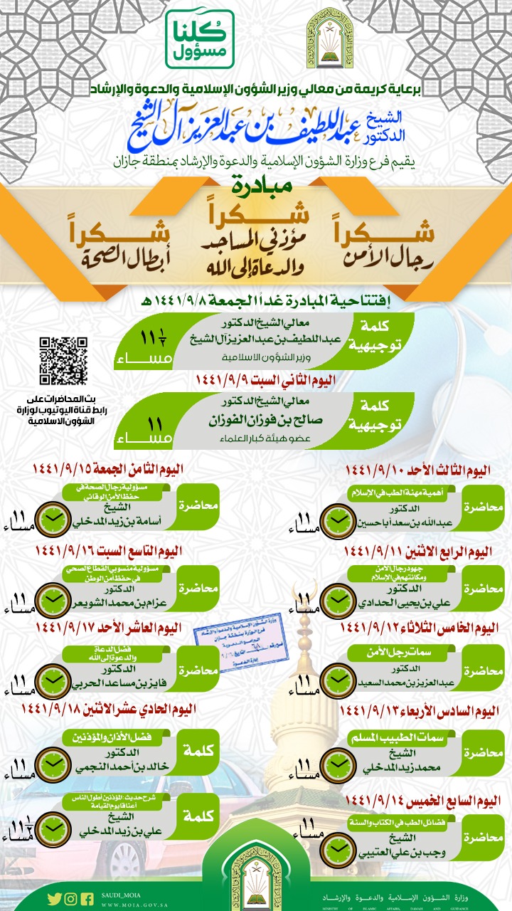 جاء ذلك خلال الكلمة التي وجهها معاليه مساء أمس بمناسبة تدشين مبادرة شكراً رجال الأمن، شكراً مؤذني المساجد والدعاة إلى الله، شكراً أبطال الصحة، والتي تنفذها وزارة الشؤون الإسلامية والدعوة والإرشاد ممثلة في فرعها في منطقة جازان، والتي ألقاها نيابة عنه فضيلة مدير عام فرع الوزارة بجازان الشيخ أسامة بن زيد المدخلي عبر قنوات الوزارة الرقمية.