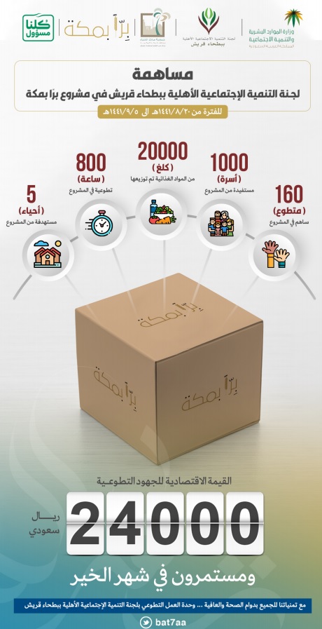 أصدرت لجنة التنمية الاجتماعية ببطحاء قريش في مكة المكرمة تقرير منجزاتها المقدمة لحملة “براً بمكة” التي أطلقها مستشار خادم الحرمين الشريفين أمير منطقة مكة المكرمة خالد الفيصل, للتخفيف على المتضررين من جائحة كورونا, حيث حملت الاحصائيات على أبرز الإنجازات من الفترة: 28 شعبان الماضي وحتى 9 رمضان الجاري لعام 1441هـ.