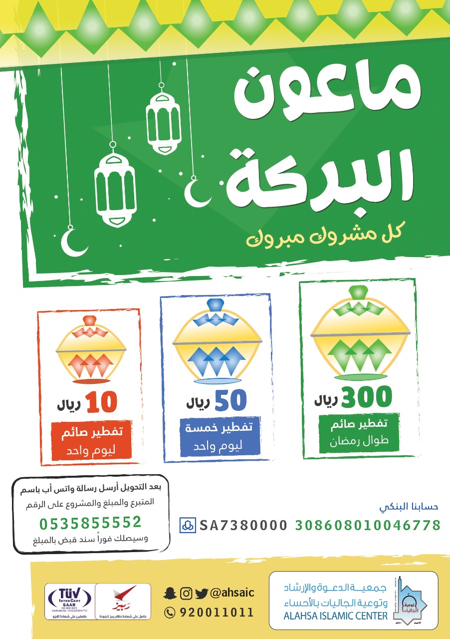 الجدير بالذكر أنّ الجمعية أطلقت مع بداية شهر رمضان الجمبارك مشروع (ماعون البركة) لتفطير الصائمين بمبلغٍ زهيد لا يتجاوز العشرة ريالات للوجبة الواحدة سعيًا منها في إتاحة الفرصة لمُحبي الخير والجود لمشاركتها هذا الثواب الكبير …