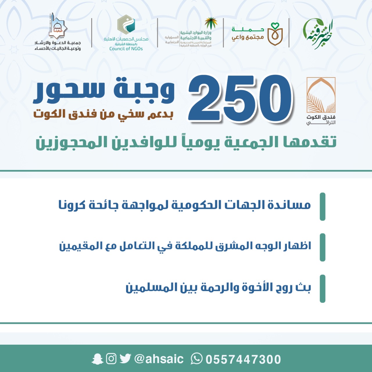 في مبادرة عظيمة جسدت روح التضامن المجتمعي؛ قامت جمعية الدعوة بالأحساء بالشراكة مع أمانة الأحساء وإدارة المسؤولية المجتمعية في فرع وزارة الموارد البشرية والتنمية الاجتماعية بالمنطقة الشرقية بالتكفل بتقديم وجبتي الإفطار والسحور للعمالة المتضررة من الجنسيّة البنغلاديشية المسلمة والمحتجزة في مدرستي (علي بن أبي طالب -رضي الله عنه- وطلحة بن عبيدالله رضي الله عنه) بالأحساء؛ وذلك لعدم قدرتهم على الخروج منها حتى تخرج نتائج فحصهم المتعلّقة بفيروس كورونا.