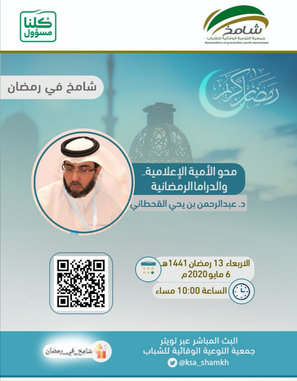 ويقدم الدكتور عبدالرحمن القحطاني العضو المؤسس بجمعية التوعية الوقائية للشباب عبر أمسية رمضانية ، مضامين المسلسلات السعودية والخليجية التي تُعرض خلال شهر رمضان،تحت عنوان محو الأمية الإعلامية والدراما الرمضانية