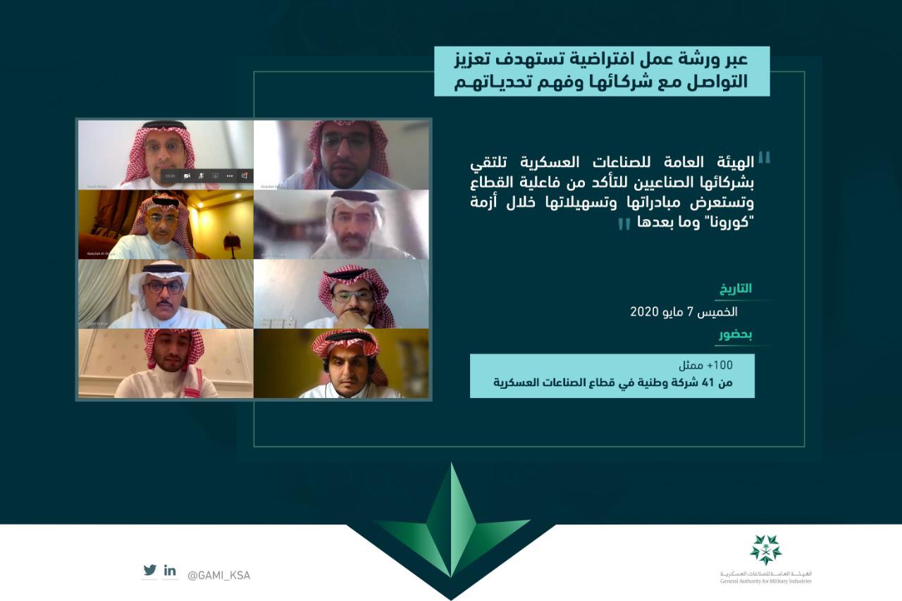 جاء ذلك خلال ورشة العمل الافتراضية والتي نظمتها الهيئة اليوم الخميس بحضور ومشاركة عدد من الشركات الوطنية العاملة في قطاع الصناعات العسكرية وتطويرها وذلك بهدف تعزيز التواصل مع شركاء الهيئة، حيث تم إبراز الخدمات والمبادرات والتسهيلات التي تقدمها الهيئة للمصنعين المحليين، وكذلك إجراءات إصدار تراخيص وتصاريح الصناعات والخدمات العسكرية وأنواعها، بالإضافة إلى استعراض حزم المبادرات والتسهيلات التي أعلنت عنها الهيئة مؤخراً والهادفة إلى مواكبة جهود الدولة المبذولة نحو تخفيف الآثار المالية والاقتصادية المحتملة حيال تداعيات انتشار جائحة فيروس كورونا الجديد (كوفيد 19) والتأكد من سير أعمال الشركات العاملة في القطاع خلال الجائحة الحالية ومدى فاعليتها، بالإضافة إلى مناقشة أبرز المقترحات للمرحلة الحالية وما بعد الأزمة.