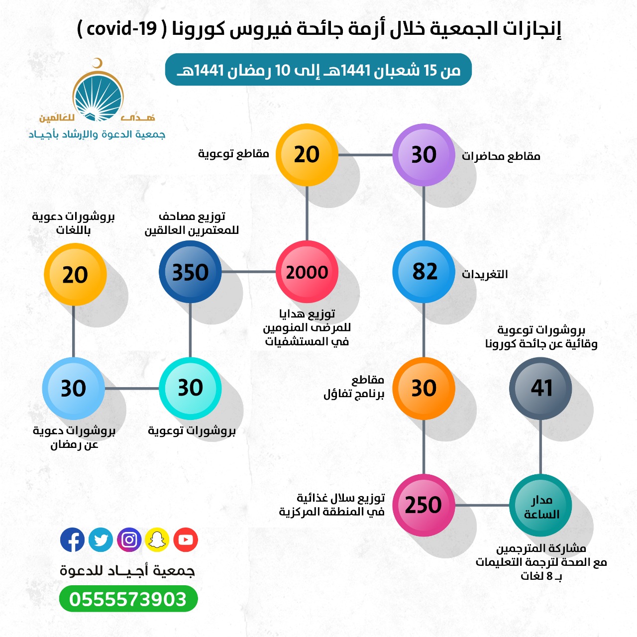 قدمت جمعية الدعوة والإرشاد وتوعية الجاليات بأجياد في مكة المكرمة العديد من المبادرات الدعوية والتوعوية المميزة لمواجهة جائحة كورونا من الفترة 15 شعبان وحتى 10 رمضان الجاري, بالمشاركة مع القطاعات المختلفة تأتي في مقدمتها وزارة الصحة ممثلة بفرعها بمكة المكرمة ومركز التنمية الاجتماعية بمكة المكرمة ومركز الدعوة والإرشاد بمكة.