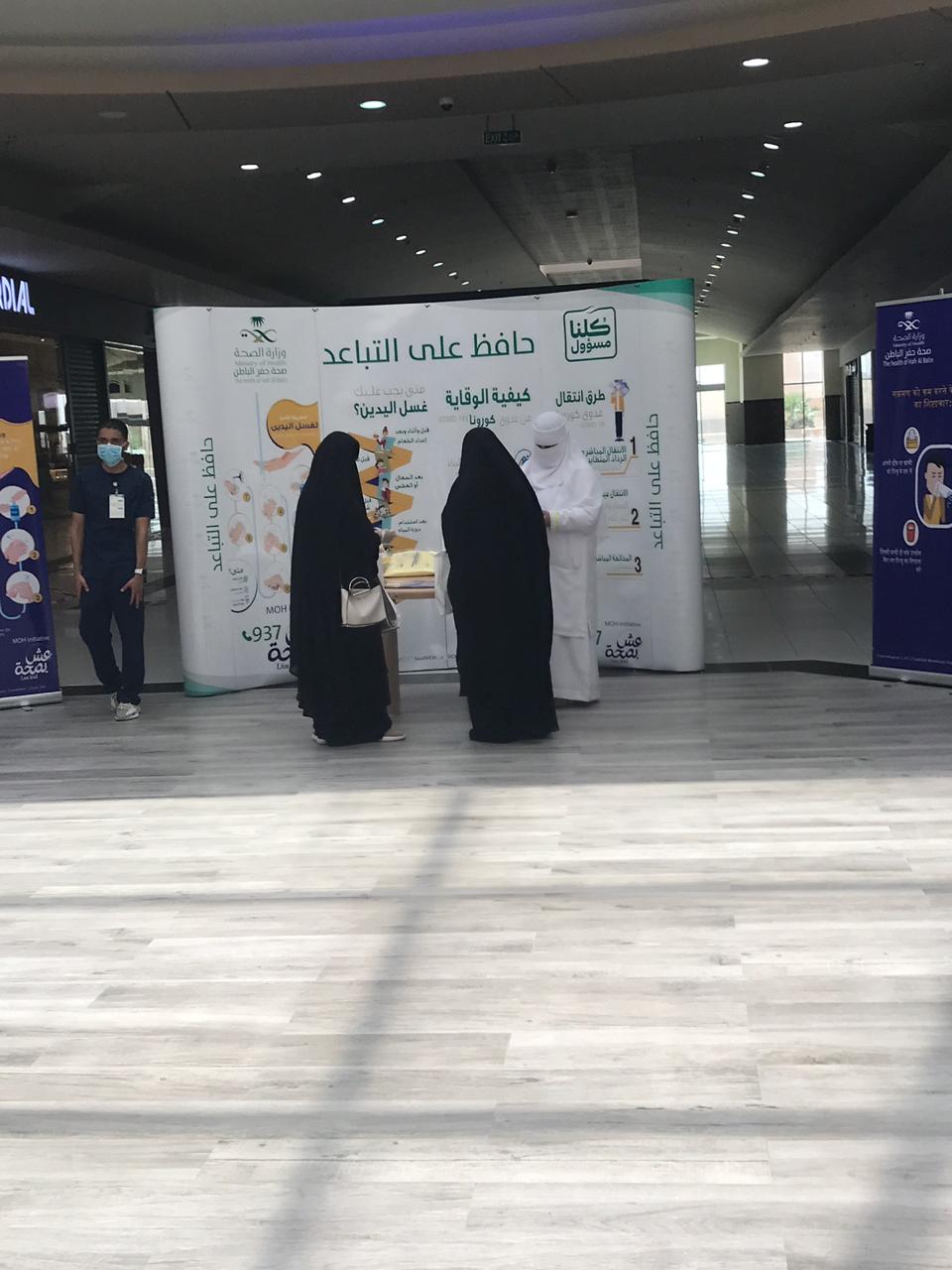 تواصل صحة حفر الباطن تكثيف حملاتها التوعوية لتثقيف المتسوقين والعاملين في المجمعات التجارية بمحافظة حفر الباطن حول أهمية الالتزام بالإرشادات والتعليمات عند التسوق وذلك بالتباعد بترك مسافة بين الأشخاص لا تقل عن 1.5 متر للمساعدة على منع إنتشار فيروس كورونا (كوفيد-19) بالإضافة إلى الإبتعاد عن التجمعات والأماكن المزدحمة وتعريفهم بالطرق الصحيحة لغسل اليدين بإستخدام المعقمات أو الماء والصابون كما قدمت الفرق الصحية النصائح والإرشادات بعدة لغات تضمنت مجموعة من الأسئلة الشائعة عن فيروس كورونا الجديد والإجابة عليها.