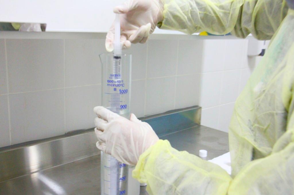 تحضير المعقم اليدوي الكحولي بغرفة التركيبات الصيدلانية في قسم الصيدلية بالمستشفى.