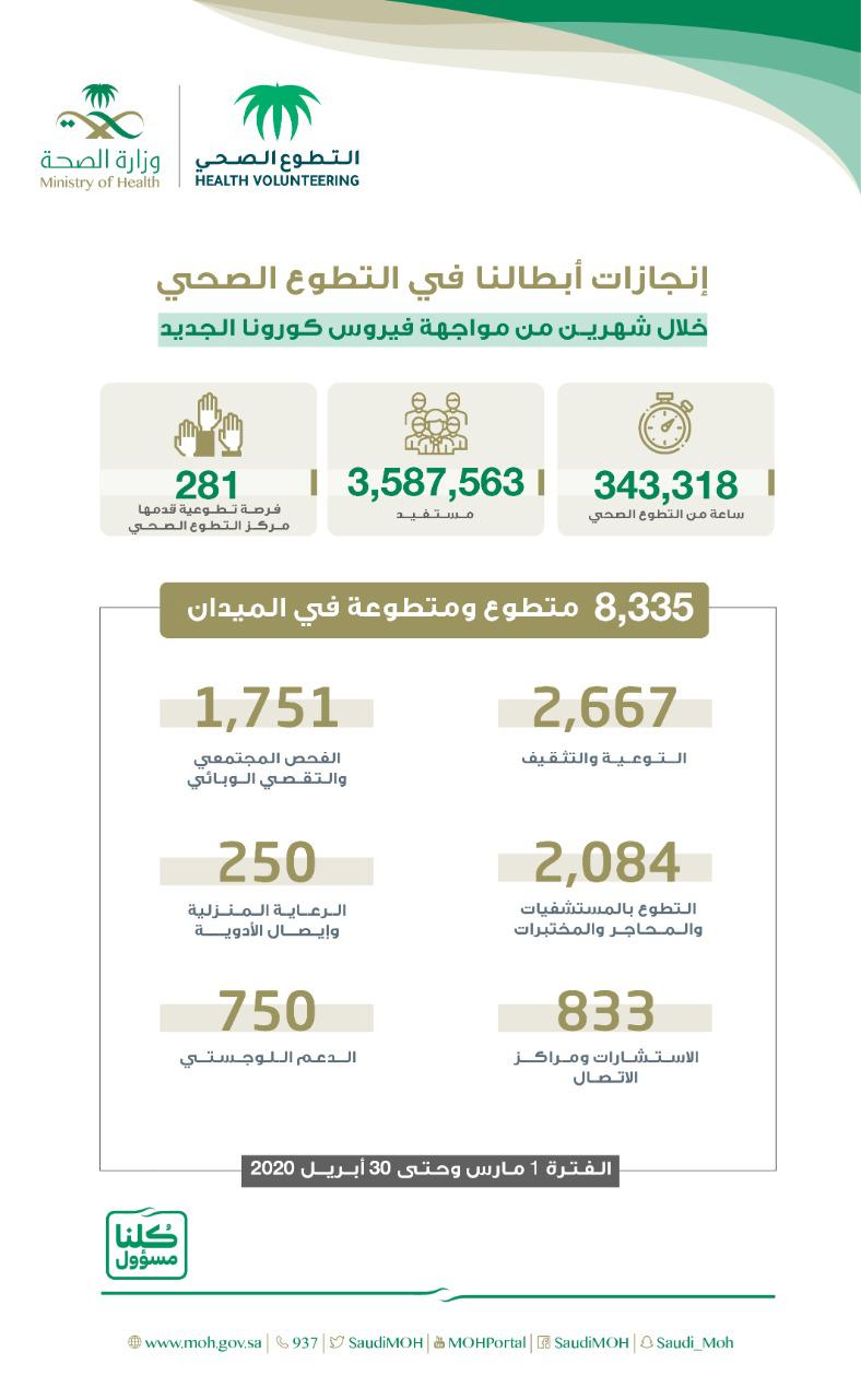 أعلن مركز التطوع الصحي بوزارة الصحة، عن وصول خدمات متطوعيه من الرعاية الصحية والتوعية والتثقيف إلى 3.5 ملايين مستفيد في مختلف مناطق المملكة خلال شهرين من الجهود المكثفة لمواجهة وباء كورونا المستجد (COVID-19)، وذلك في الفترة من 1 مارس إلى 30 إبريل.
