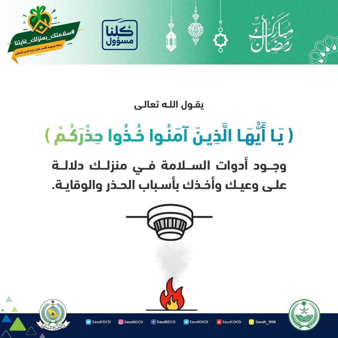 وذكر أن حملة “سلامتك بمنزلك غايتنا”، التي أطلقتها المديرية العامة للدفاع المدني تهدف إلى التأكيد على أهمية توفر وسائل السلامة الوقائية في المنزل، وتوخي الحذر من الأخطار الموجودة بالمنازل خلال فترة الحجر المنزلي، ورفع مستوى الوعي الوقائي والسلامة بين جميع شرائح المجتمع كافة ، تتضمن إقامة المحاضرات ، ونشر عدد من الرسائل التوعوية عن الحملة عبر المواقع الإلكترونية وحسابات مواقع التواصل الإجتماعي ، ولفت إلى أنه في حالة الرغبة في معرفة تفاصيل أكثر عن الحملة يرجى متابعة الموقع الرسمي للمديرية العامة للدفاع المدني www.998.gov.sa وحساباته على مواقع التواصل الاجتماعي المختلفة ، متمنيا السلامة للجميع.