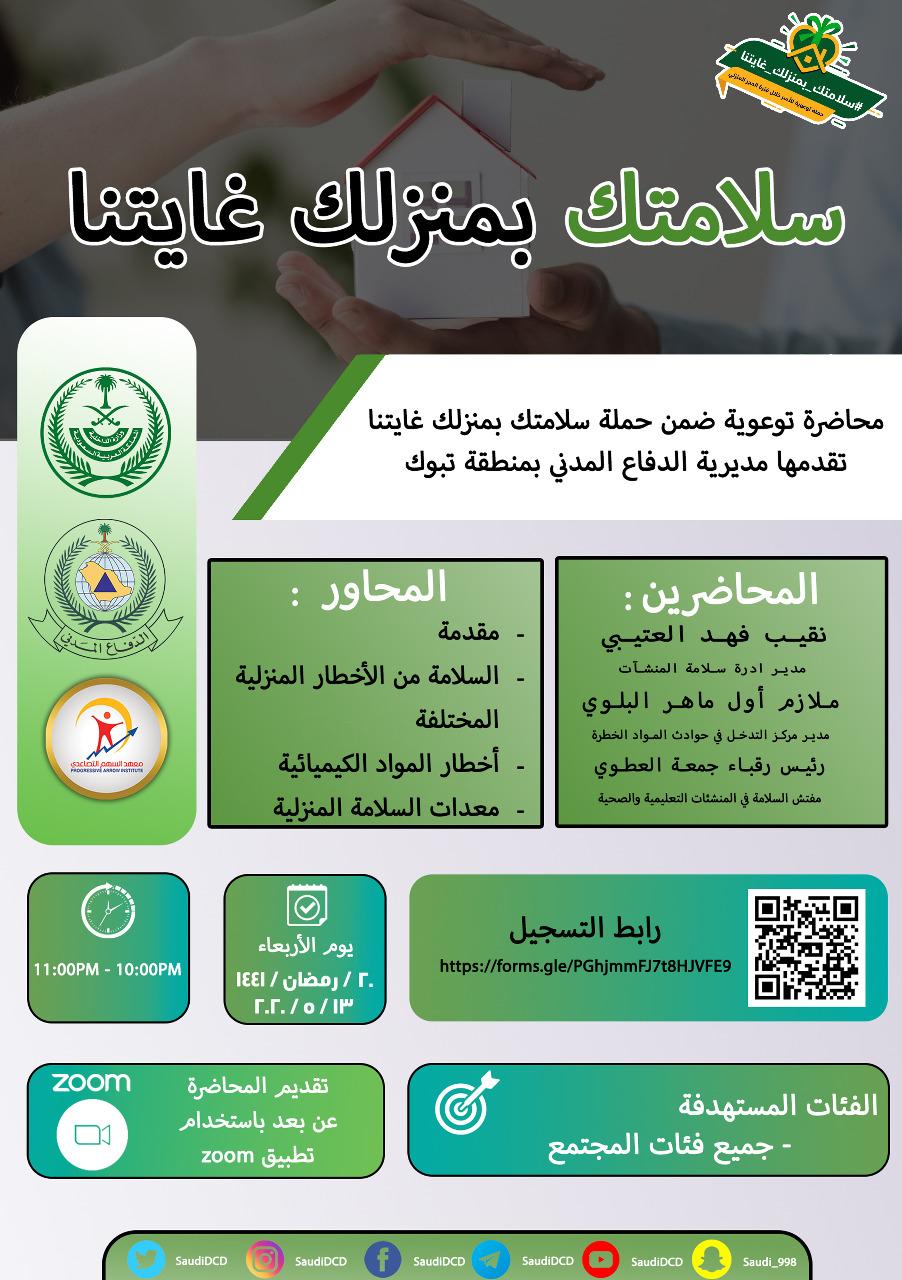 عقدت مديرية الدفاع المدني بمنطقة تبوك بالتعاون مع مؤسسة السهم التصاعدي للتدريب يوم أمس محاضرة توعوية ضمن حملة “سلامتك بمنزلك غايتنا”، عبر تطبيق “زووم” ، وذلك بعد ان تم تسجيل حوالي (1210) مستفيد من مختلف شرائح المجتمع بعد الإعلان عن المحاضرة .