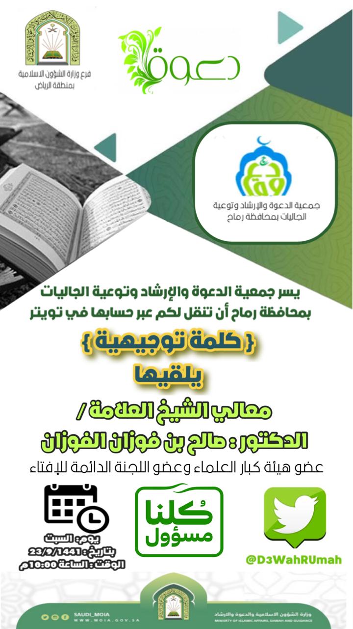 يلقي معالي عضو هيئة كبار العلماء عضو اللجنة الدائمة للإفتاء الشيخ الدكتور صالح بن فوزان الفوزان، بعد غدٍ السبت الثالث والعشرين من شهر رمضان المبارك 1441هـ، كلمة توجيهية ضمن البرنامج الدعوي الذي ينظمه فرع وزارة الشؤون الإسلامية والدعوة والإرشاد بمنطقة الرياض، بالتعاون مع جمعية الدعوة والإرشاد وتوعية الجاليات بمحافظة رماح، خلال الشهر الفضيل، وذلك عبر البث المباشر في حساب الجمعية بتويتر.
