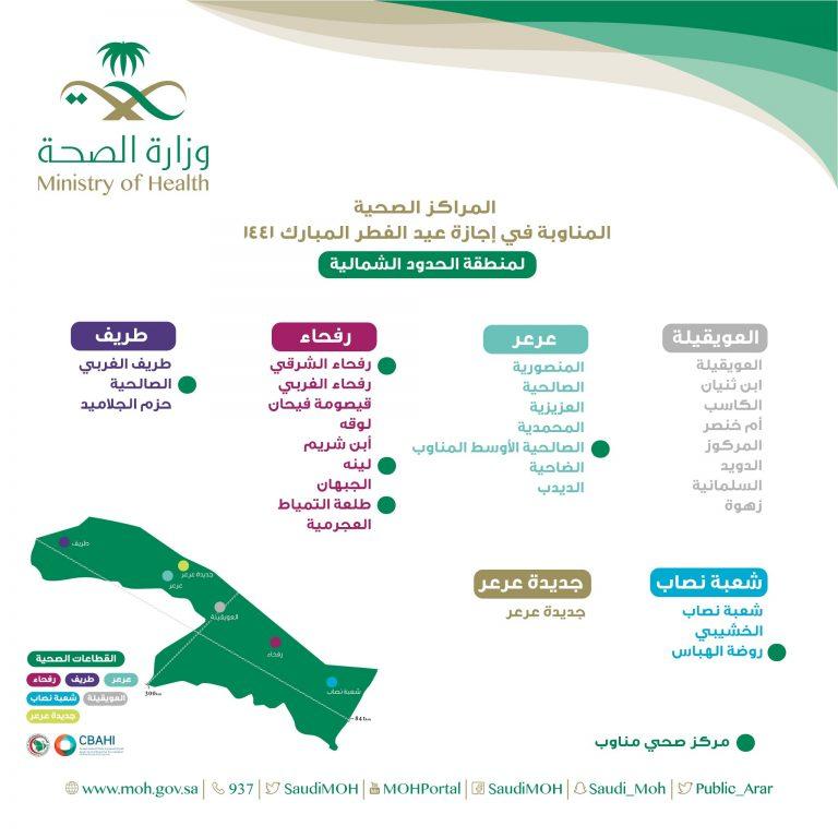 صحة منطقة الحدود الشمالية تعلن اسماء المراكز الصحية المناوبة في إجازة عطلة عيد الفطر المبارك https://www.alshaamal.com/?p=97979 تم النشر في: 16 مايو، 2020 11:02 م 990680 صحيفة الشمال الإلكترونية فواز صايل الرويلي أعلنت صحة منطقة الحدود الشمالية عن اسماء المراكز الصحية التي سوف تستمر بالمناوبة خلال إجازة عطلة عيد الفطر المبارك لعام 1441 هـ في كافة مناطق المنطقة .