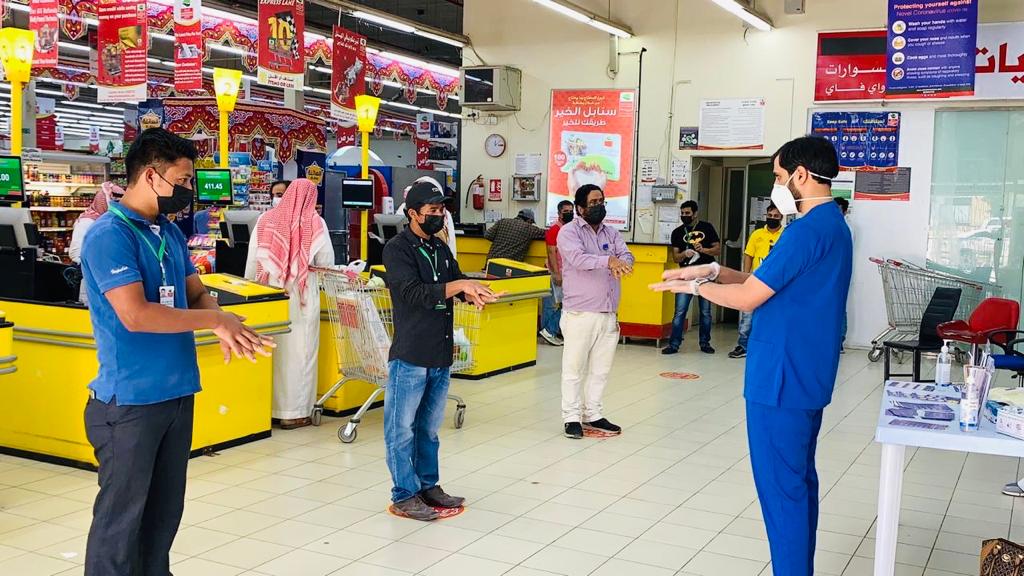 كثفت المديرية العامة للشؤون الصحية بحفر الباطن حملاتها الميدانية في المجمعات التجارية بهدف توعية المتسوقين بطرق الوقاية من خلال إتباع التعليمات والإرشادات والتأكد من التزامهم بالإجراءات الاحترازية والوقائية للحد من انتشار فيروس كورونا ( كوفيد-19) وقدمت الفرق الصحية مجموعة من الإرشادات والنصائح تضمنت تعقيم عربات التسوق وتوفير الكمامات والقفازات للمتسوقين عند مداخل مراكز التسوق وترك مسافات آمنة بين المتسوقين لا تقل عن مترين وكذلك قياس درجة الحرارة قبل الدخول، وتثقيفهم بالابتعاد عن التجمعات والأماكن المزدحمة وعدم الخروج إلا في حالات الضرورة القصوى ،بالإضافة إلى توزيع المنشورات والمطويات على المواطنين والمقيمين ، وتأتي هذه الحملات تماشياً مع توجيهات وتعليمات وزارة الصحة للوقاية من فيروس كورونا (كوفيد-19) ومنع انتشاره