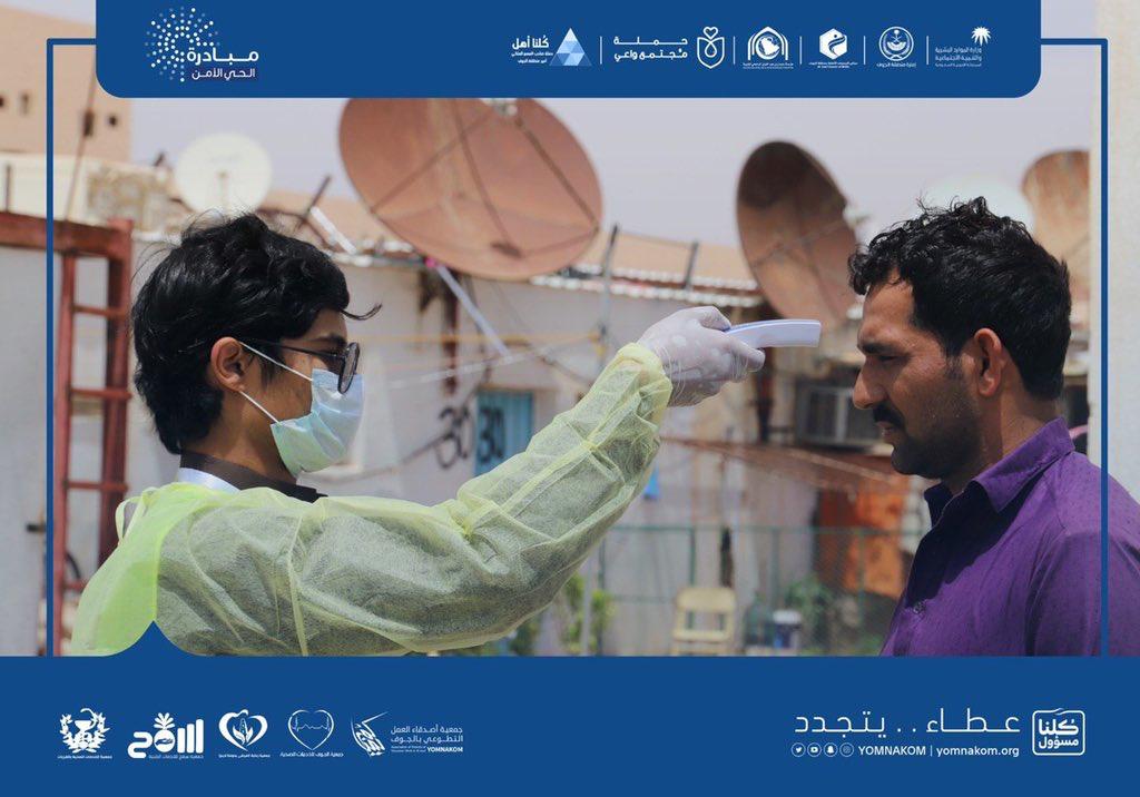 فقد قام المتطوعون بأكثر من 1490 خدمة تطوعية ؛ بواقع 3969 ساعة تطوعية تم من خلالها توزيع أكثر من 2119 سلة غذائية ، و تقديم أكثر من 10،221 عينة فرز بصري ، وتوزيع أكثر من 15000 عبوة ماء ، وتعقيم أكثر من 22 موقع سكني .