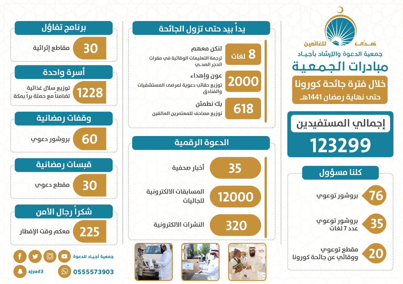 استعرضت جمعية أجياد للدعوة والإرشاد في مكة المكرمة إنجازاته خلال شهر رمضان الحالي, حيث بلغ عدد المستفيدين من برامجها أكثر من (123299) مستفيداً من المعتمرين العالقين وسكان منطقة الحرم المكي.