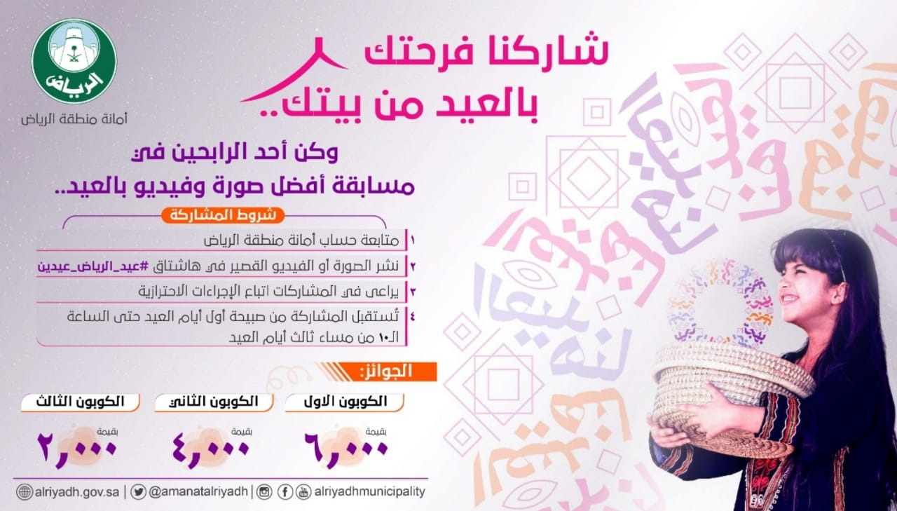 كما طرحت الأمانة مسابقة أفضل صورة وفيديو بالعيد، والتي تمتد على مدى ثلاثة أيام، إلى جانب إنتاجها لأغنية العيد، وتنفيذ فعالية إطلاق البالونات في سماء مدينة الرياض عند الساعة الخامسة عصرًا تعبيرًا عن الفرح والمسرات.
