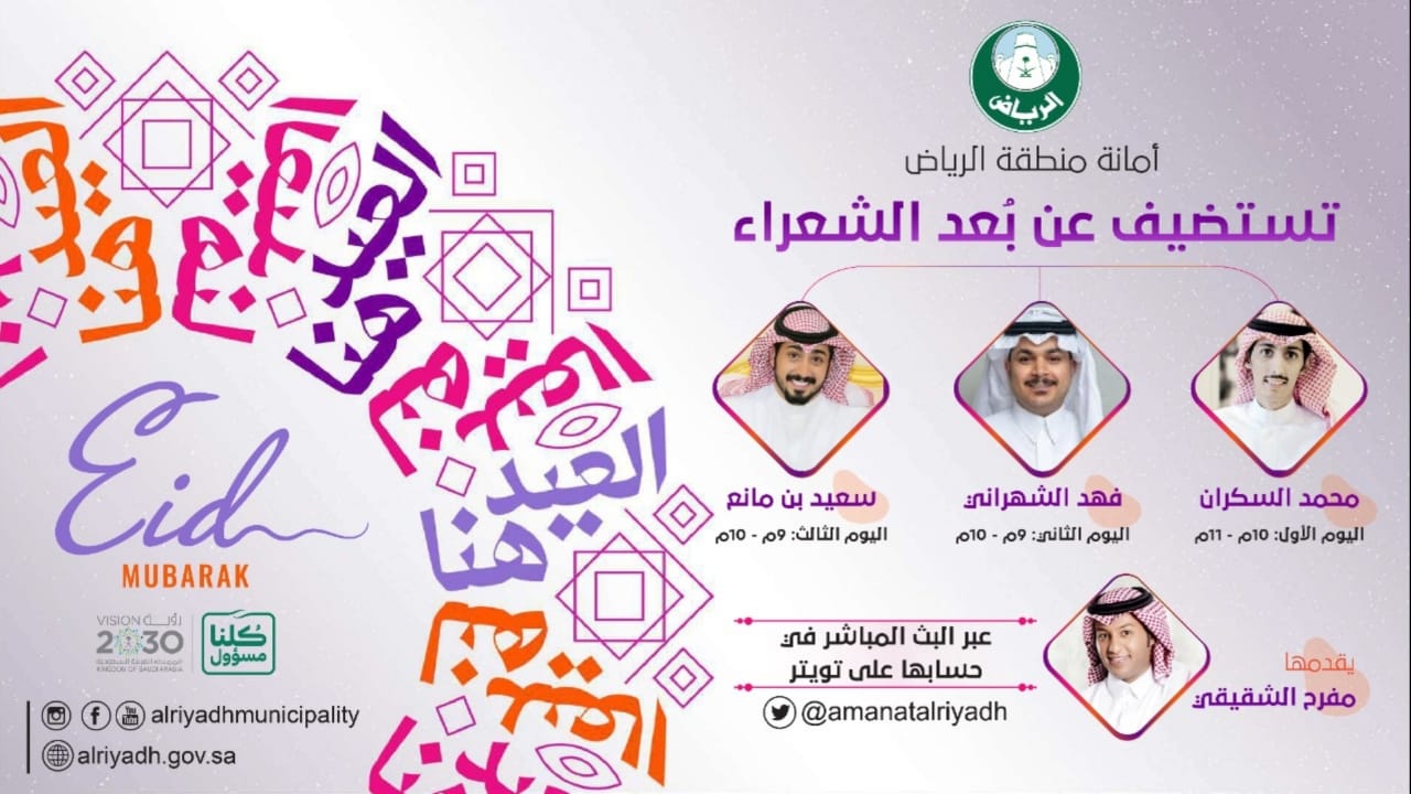 ونظمت أمانة الرياض أمسية شعرية في أولى ليالي العيد باستضافة الشاعر محمد السكران، وتليها أمسيتان للشاعرين فهد الشهراني وسعيد بن مانع خلال اليومين الثاني والثالث من شوال، ضمن اهتمامها بالموروث الشعبي، ودعم المواهب الشبابية البارزة في مجال الشعر.