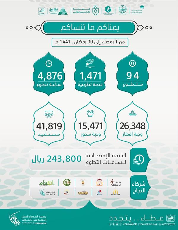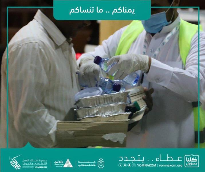 ساهم متطوعو جمعية أصدقاء العمل التطوعي بالجوف (يمناكم) ، بتوزيع 26348 إفطار صائم و 15471 وجبة سحور ؛ شملت 41819 مستفيدًا ، وتم توزيع الواجبات على الأسر المحتاجة و المتعففة في منازلهم ، بالإضافة إلى مواقع سكن العمالة و ذلك ضمن الإجراءات الاحترازية لمواجهة انتشار فيروس كورونا .