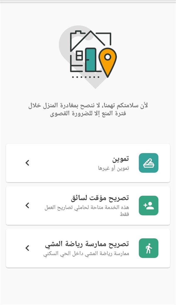 وأوضح أنه بالإمكان طلب التصريح للمشي وحيدا أو برفقة شخصين كحد أقصى ضمن نطاق الحي السكني، على أن يكون لكل منهم تصريح مستقل من تطبيق “توكلنا”.